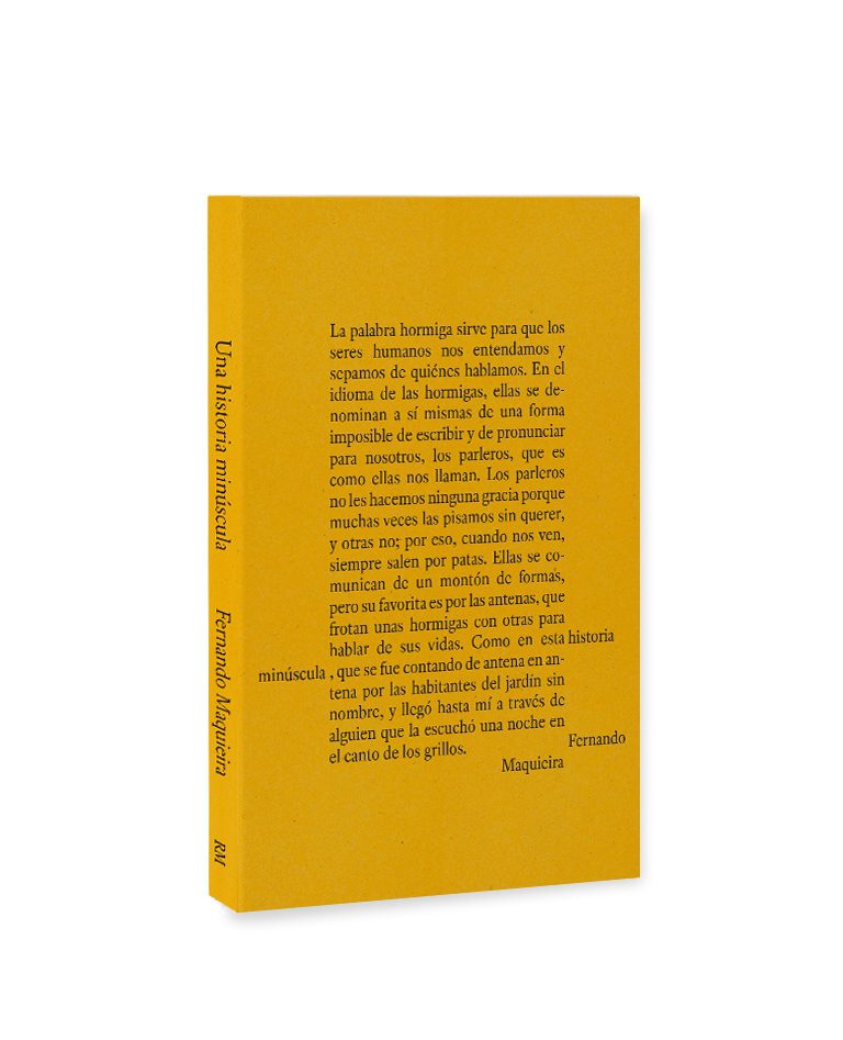 «La palabra hormiga sirve para que los seres humanos nos entendamos y sepamos de quiénes hablamos. En cl idioma de las hormigas, ellas se denominan a sí mismas de una forma imposible de escribir y de pronunciar para nosotros, los parleros, que es como ellas nos llaman, Los parleros no les hacemos ninguna gracia porque muchas veces las pisamos sin querer, y otras no: por eso, cuando nos ven, siempre salen por patas. Ellas se comunican de un montón de formas, pero su favorita es por las antenas, que frotan unas hormigas con otras para hablar de sus vidas. Como en esta historia minúscula que se fue contando de antena en antena por las habitantes del jardín sin nombre y llegó hasta mí a través de alguien que la escuchó una noche en el canto de los grillos», escribe Fernando Maquieira en la contraportada de su libro.
